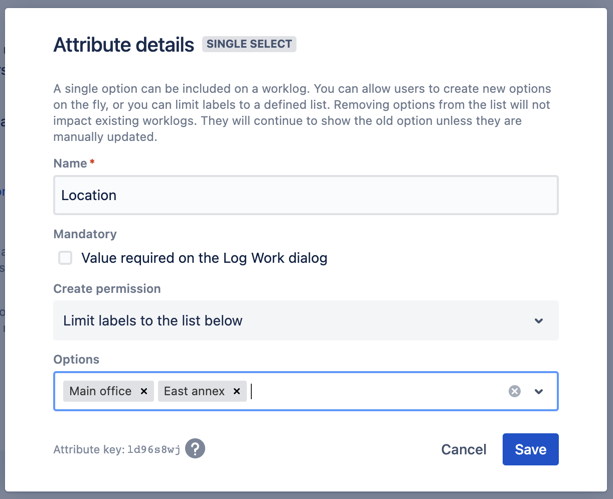 Worklog attributes are fields (checkboxes, dropdowns, labels) that you can add to your worklogs. You can add up to 10 attributes to your worklogs and can make them required or optional. You do not have to create a corresponding Jira custom field for your worklog attributes.